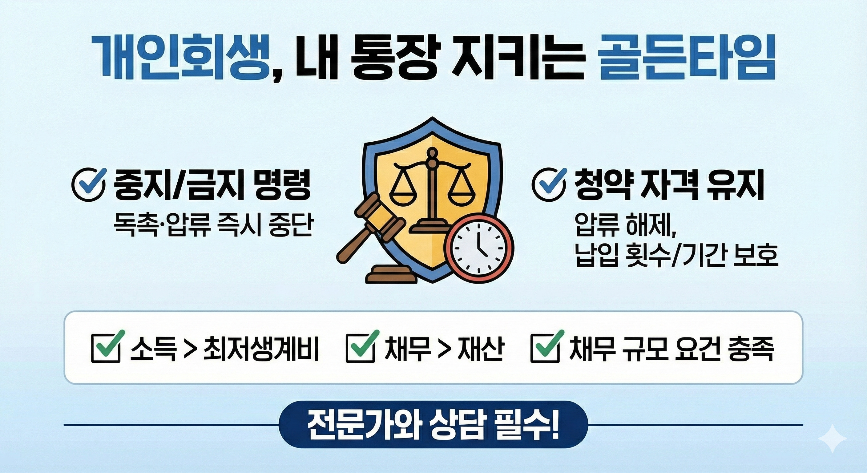 - 중지/금지 명령: 개인회생을 신청하고 법원에서 금지명령이 나오면, 그 즉시 모든 채권자의 독촉과 압류 절차가 법적으로 금지됩니다. 이미 진행된 청약통장 압류도 중단시킬 수 있습니다.